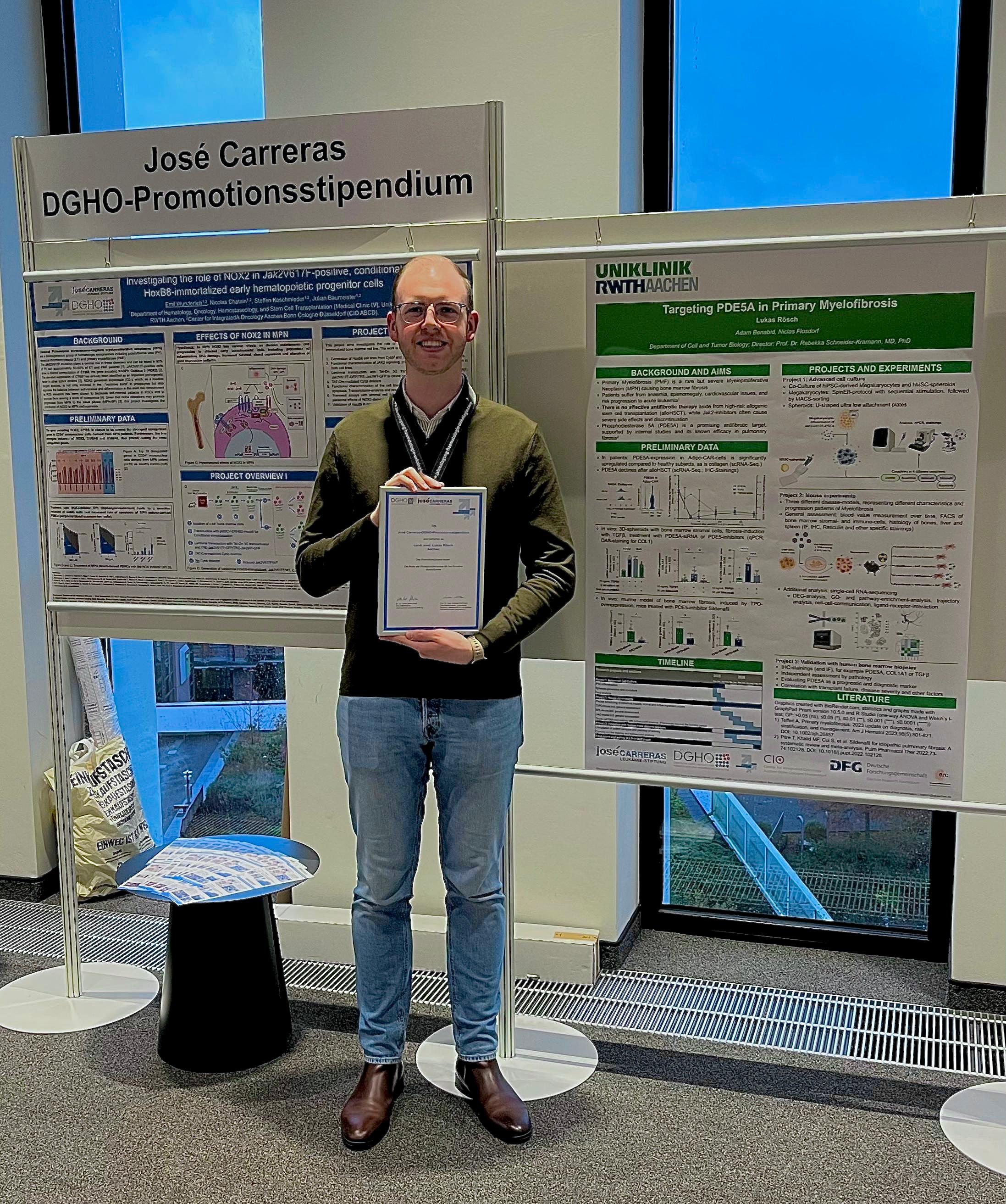 Durch das renommierte José Carreras-DGHO-Promotionsstipendium kann Lukas Rösch im kommenden Jahr ein Forschungsprojekt im Bereich der seltenen Blut- und Knochenmarkerkrankung Myelofibrose am Institut für Zell- und Tumorbiologie an der Uniklinik RWTH Aachen unter der Leitung von Univ.-Prof. Dr. med. Rebekka Schneider-Kramann, PhD, durchführen.